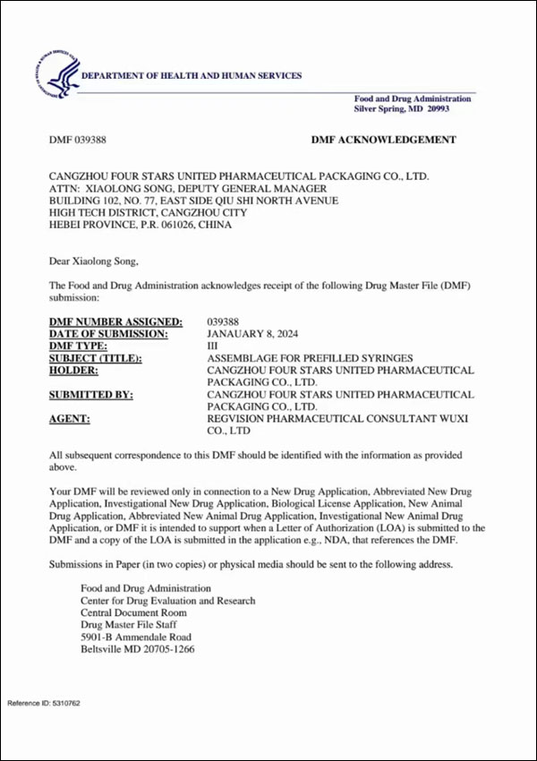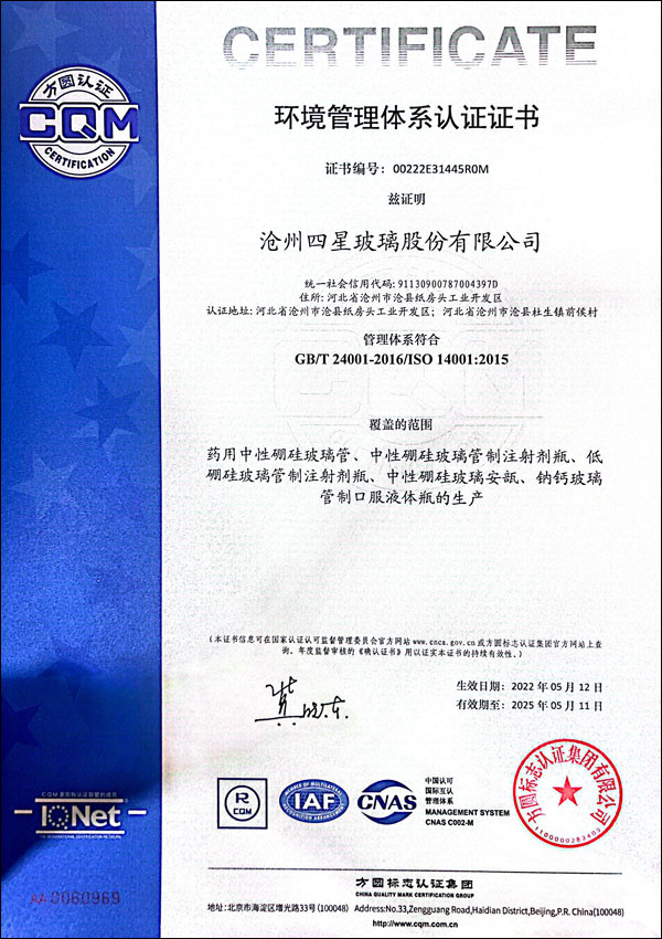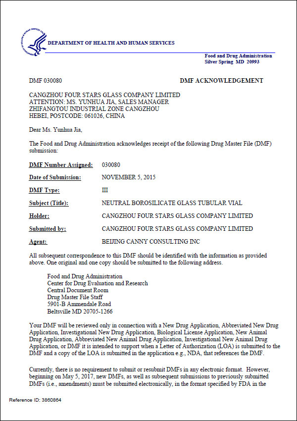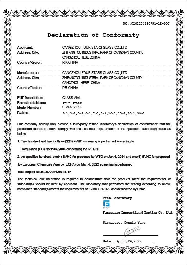 DMF西林瓶認證證書